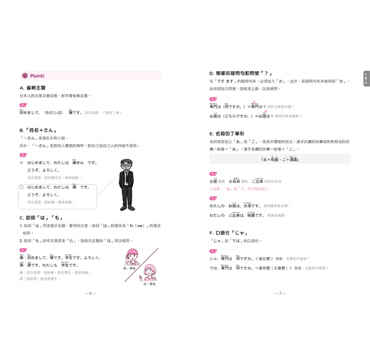 本間老師特闢一部分專門解說,針對重要文法概念、口語的日語使用一一做介紹,讓學習者能在熟悉基本文型、簡單會話後,更深入了解增強日語會話實力的加分利器。