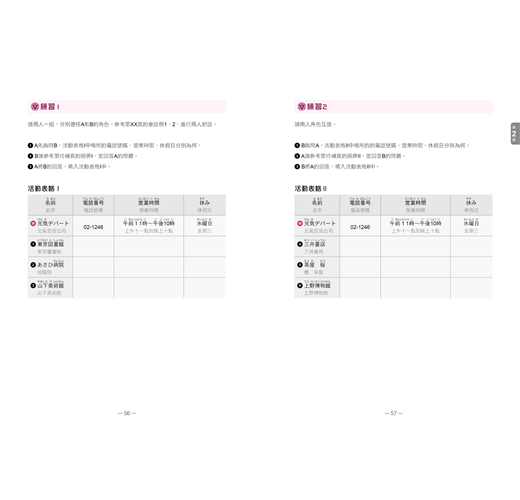 會話不是只要會「說」,還要會「聽」,本間老師在學習總複習安排了會話、聽力共2個部分,除了和他人練習互相對話,也要練習聽出CD播放的會話中,有什麼談話重點;或是聽CD播放的問題,練習回答;在如此多元的練習之下,不僅能增快進行日語會話時的反應速度,也能拓展話題的豐富度。