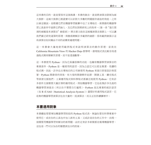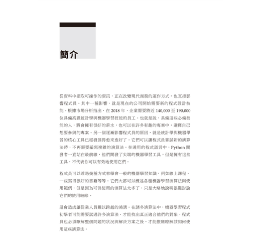 作者 Michael Bowles 具備多年的機器學習經驗,將帶領你設計、建構與使用自己的機器學習解決方案。他會用很簡單的方式來解釋演算法,不會使用複雜的數學,並提供範例程式,來協助你盡早上手。你將會深入鑽研建構機制,學習如何選擇與使用最能夠解決手上問題的演算法,無論你的問題簡單或複雜。這本書會透過詳細的範例,以具體、可修改的程式來說明機制,並說明線性迴歸與整體方法,協助你瞭解機器學習的基礎工作程序。這些方法都很有效率,而且經過測試,它們的結果可說明一切。