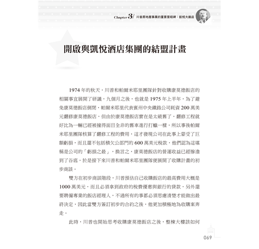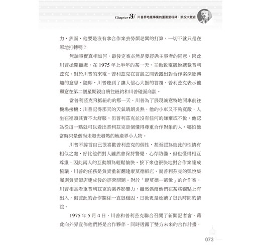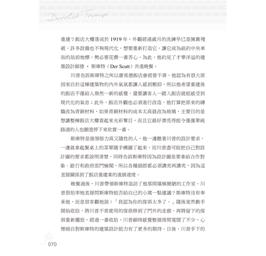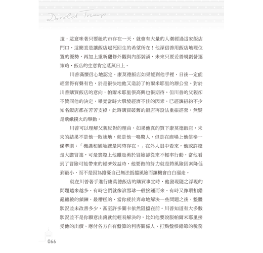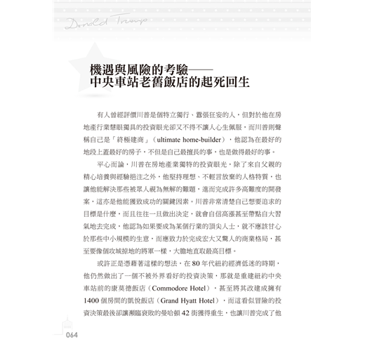 透過本書我們能看到一個真實的川普,看到他的內心世界,看到川普是怎樣工作,怎樣生活和如何思考的,又是怎樣與那些競爭者、反對者鬥智鬥勇的。本書側重描述了他在地產事業上是如何一步步起家和飛黃騰達的,更展現了他出色的市場觀察能力和處理商業危機的能力。