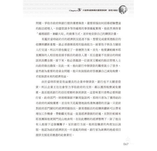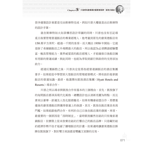 有個小故事是川普在蓋高爾夫球場的時候,他非常在乎球場所種植的樹木,所以特意聘請對特定樹種有所鑽研的專家提供意見,他自己也花費不少時間去研究,當他知道有人對他這樣的舉動深感意外時,他反而覺得很困惑,因為他認為「川普」代表的是高品質品牌,而維持高品質的關鍵,就是即便是一片樹林這樣的細節也要給予關注,細節往往也是奠定你是否能夠卓越的基礎之一。