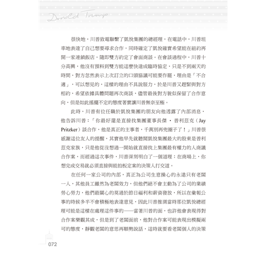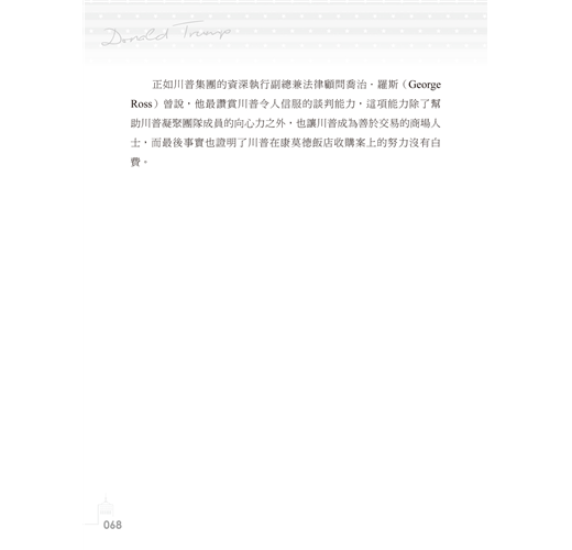 透過本書我們能看到一個真實的川普,看到他的內心世界,看到川普是怎樣工作,怎樣生活和如何思考的,又是怎樣與那些競爭者、反對者鬥智鬥勇的。