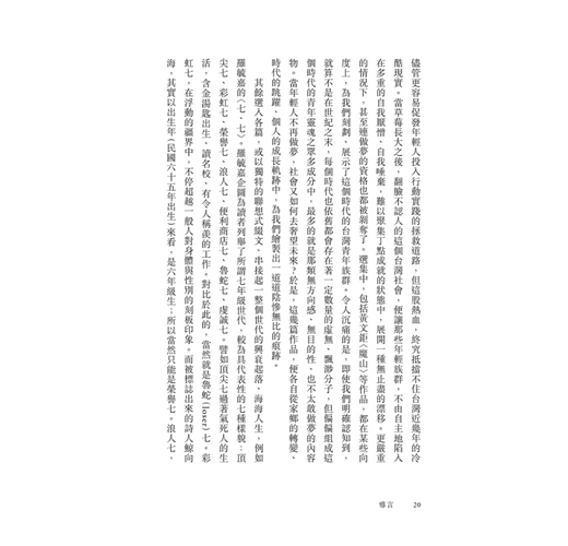 其餘選入各篇,或以獨特的聯想式綴文、串接起一整個世代的興衰起落、海海人生,例如羅毓嘉的〈七、七〉。羅毓嘉企圖為讀者列舉了所謂七年級世代,較為具代表性的七種樣貌:頂尖七、彩虹七、榮譽七、浪人七、便利商店七、魯蛇七、虔誠七。譬如頂尖七過著氣死人的生活,含金湯匙出生、讀名校、有令人稱羨的工作。對比於此的,當然就是魯蛇(loser)七。彩虹七,在浮動的疆界中,不停超越一般人對身體與性別的刻板印象。而被標誌出來的詩人鯨向海,其實以出生年(民國六十五年出生)來看,是六年級生;所以當然只能是榮譽七。浪人七,則是勇敢返鄉的遊子。便利店七,是在通才教育下培養出的小螺絲釘。在無限衍生的商店服務中,努力保持雨後的乾淨地板、在廚房裡被燙傷……而祈願這個世代獲得一種莊嚴的修復,莫過於虔誠七了。正如同羅毓嘉筆下的這些「七」、彼此之間相互矛盾,就某個角度言,台灣社會內在實況也恰如七年級世代的上訴縮影般、彼此歧異混雜錯亂到不行。「有人巴不得的要弒君殺神同時反死刑」。但是,這些「七」仍會感動,失戀時還哭得出來,看一場舞能產生些悸動。這些「七」之中,多數人在這輩子注定無法在台北買下任何一方容身之處。在各式各樣的符號裡,三一八學運「意象符指雞排妹都變成裝飾自己身上的好料」,在這座「吃人的島嶼」裡,希望能得到快樂的「七」們,從而混雜出各種台灣社會造型的可能樣態。