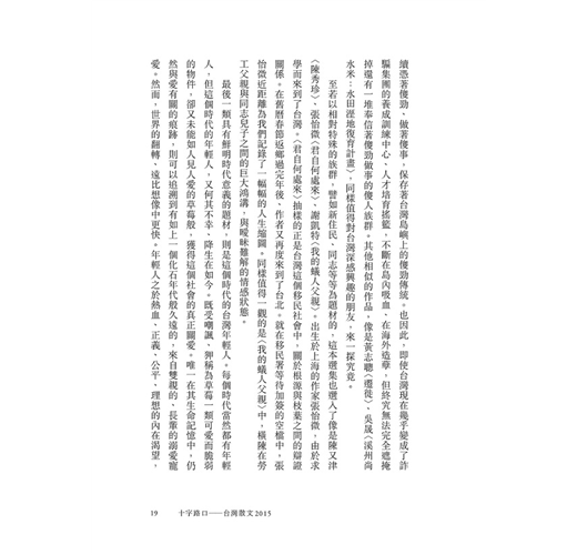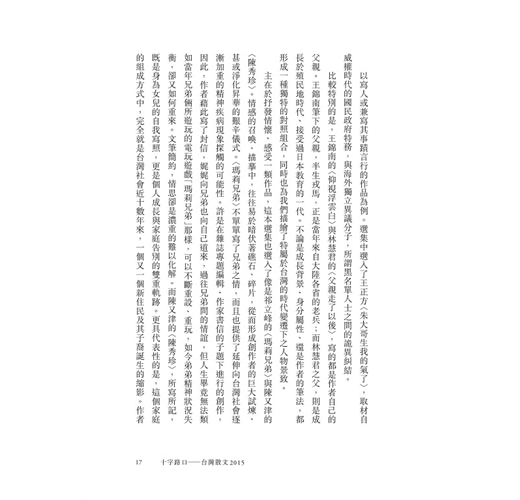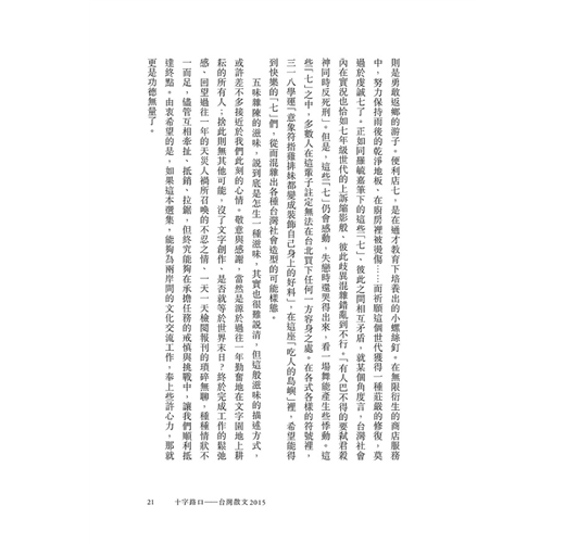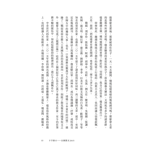 五味雜陳的滋味,說到底是怎生一種滋味,其實也很難說清,但這般滋味的描述方式,或許差不多接近於我們此刻的心情。敬意與感謝,當然是源於過往一年勤奮地在文字園地上耕耘的所有人;捨此則無其他可能,沒了文字創作、是否就等於世界末日?終於完成工作的鬆弛感、回望過往一年的天災人禍所召喚的不忍之情、一天一天檢閱報刊的瑣碎無聊,種種情狀不一而足,儘管互相牽扯、抵銷、拉鋸,但終究能夠在承擔任務的戒慎與挑戰中,讓我們順利抵達終點。由衷希望的是,如果這本選集,能夠為兩岸間的文化交流工作,奉上些許心力,那就更是功德無量了。