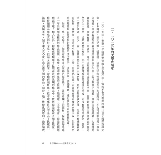 那麼,在二○一五年整個年度的文字創作中,是否也同樣能夠用一種年度代表字的方式,來加以概括?坦白說,硬要去指派某個單一的特定概念、特色,來涵蓋一整年的文字作為,無疑存在著太過巨大的危險、太過專擅的武斷。但雖然如此,如果我們把它放寬來看,令其不再侷限於單一形態,則或許,還是有機會稍微展現出過往一整年的文字寫作成績及其相對特徵。