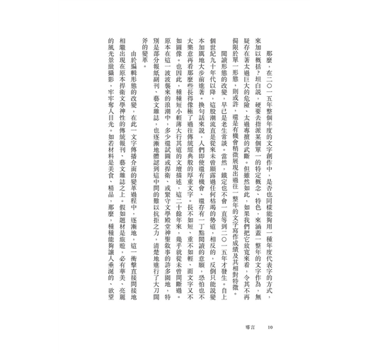 閱讀形態的改變,早已是老生常談。當然,鐵定也不會一直等到二○一五年才發生。自上個世紀九十年代以降,這股潮流直是從來未曾顯露過任何枯竭的勢道,相反的,反倒只能說變本加厲地大步前進著。換句話來說,人們即使還有機會、還存有一丁點閱讀的意願,恐怕也不大樂意再看那麼些、長得像極了過往傳統經典般的厚重文字。長不如短、重不如輕、而文字又不如圖像。也因此,種種短小輕薄大行其道的文壇描述,這二十餘年來,幾乎就從未曾間斷過。原本在這一波波襲來的浪潮中,多少還試圖或捍衛、或緊守文學殿堂神聖敘事的許多園地,特別是部分報紙副刊、藝文雜誌,也逐漸地體認到這中間的難以抗拒之力,清楚地進行了大刀闊斧的變革。