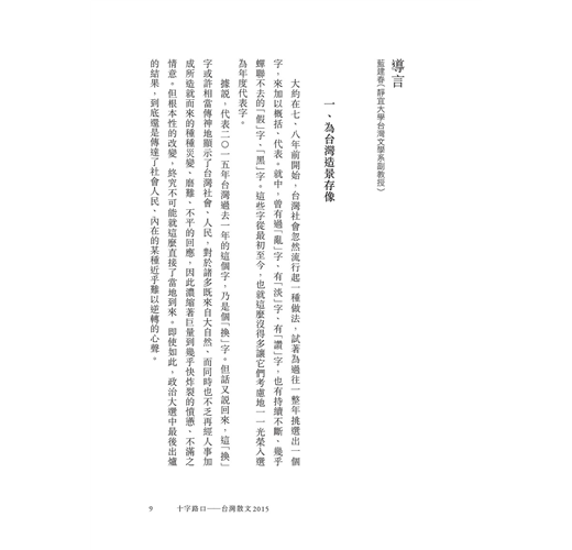 除了那些難以一言道盡的個人偏好、偏惡之外,這本文選,企圖能夠在兩個軸線上去展現過往一整年的散文寫作成績。其一在於文中所顯現、連結、對應、批判、牽纏的台灣社會,不論是族群、歷史、文化、還是政治災難、運動休閒,要言之,這些作品能夠為讀者展現出,或者引領讀者觀察到,台灣社會相對獨特的任何特定面向。也因此,藉由整本年度文選,我們所希望呈現的,乃是一幅又一幅,出自不同世代、不同族群背景、不同政治想像的作家,所繪製的台灣造景。其二,在第一個編選原則的基礎上,作為輔助性的第二個考量則是,盡可能照顧到文字形式上的成就、特色。換句話說,這本文選並不以所謂美文、文章流利、文字奇巧等等,作為編選的主要心法,相對地,在文字順暢的基礎上,能夠鏈結種種台灣過往的、現在的、未來的造景圖像,才是這本文選最根本的想望。