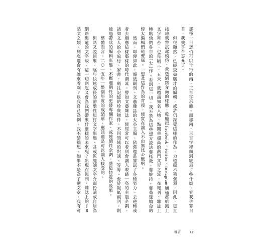 但很顯然,已經絞盡腦汁的編輯,或許仍深覺這樣的作為,力道還不夠強烈,因此,更直接地就嘗試起模仿、營造網路介面的樣態,乾脆把Facebook、twitter、Instagram通通都給搬上文字舞台,也每隔三、五天,就邀請知名人物、點閱率超高的熱門文青之流,在報刊、雜誌上轉貼他們各自的「大」作。看到這一切,我不禁為這些想方設法要拯救、要維持、要苟延續命的偉大編輯們道聲屈。一想及這作為的背後,便實在讓人不由無比心酸啊。