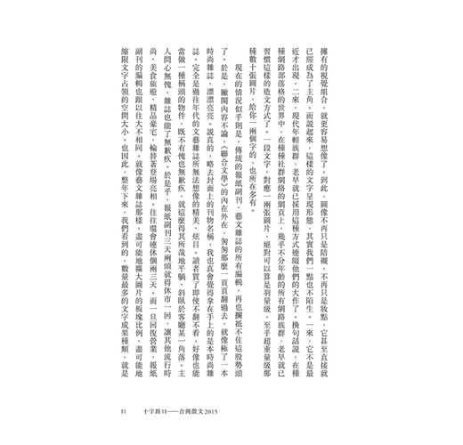 現在的情況似乎則是,傳統的報紙副刊、藝文雜誌的所有編輯,再也攔抵不住這股勢頭了。於是,撇開內容不論,《聯合文學》的內在外在,匆匆那麼一頁頁翻過去,就像極了一本時尚雜誌,漂漂亮亮。說真的,略去封面上的刊物名稱,我也真會覺得拿在手上的是本時尚雜誌。完全是過往年代的文藝雜誌所無法想像的精美、炫目。讀者買了即使不翻不看,好像也能當做一種稱頭的物件,既不有愧也無歉疚,就這麼得其所哉地平躺、斜臥於客廳某一角落。主人問心無愧,雜誌也能了無歉疚。於是乎,報紙副刊三天兩頭就得休市一回,讓其他流行時尚、美食旅遊、精品豪宅,輪替著登場亮相。往往還會連休個兩三天。而一旦回復營業,報紙副刊的編輯也跟以往大不相同。就像藝文雜誌那樣,盡可能地擴大圖片的板塊比例,盡可能地縮限文字占領的空間大小。也因此,整年下來,我們看到的,數量最多的文字成果種類,就是那種一目恐怕可以十行的兩、三百字型態。而那兩、三百字裡頭到底寫了些什麼,容我告罪自首,我幾乎全忘光了。