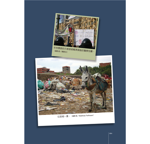 終於,一塊方布上的圖案引起了我的注意。埃及科普特基督教十字架的四個底端又各生出小十字架,遠看就像是一朵朵的小花。布塊上的十字架由一把手槍指著,我立刻聯想到二○一○年年初,開羅南部的上埃及地區基督徒遭到穆斯林槍殺事件。歷史上埃及穆斯林及基督徒雖然難免有磨擦,基本上他們各自生活,相安無事,只是近來不斷有衝突發生,有些基督徒少女被綁架、被迫改信伊斯蘭並且遭到逼婚。事情發生後,多數信奉伊斯蘭的警察,通常護著自己的兄弟,使得受侮的基督徒無處申冤。我好奇地想知道,這場示威有可能演變成什麼情況。衝突規模的預測,通常警方會以線民的通報做為評估的標準。我拍了幾張標語照片後便離開現場,走到隔街,果然有一部載滿武裝警察的黑車停駐。拐入小道,仍然有其他武裝部隊待命。我再繞回現場,再站在同一棵樹下,示威人仍輪流呼叫口號,輪流高舉布塊。不一會兒,就在我正前方,有人拿來幾把白色附靠背的塑膠椅及一張塑膠桌;再過一會兒來了五個分別穿著黑色及灰色西裝的男人,他們悠閒地坐在白椅上,立刻有人送上滾燙的紅茶。他們的舉止和示威現場的氣氛完全不搭調,有的講手機,有的相互交談,好像在咖啡廳一般地閒適。我對他們好奇,取出相機,準備對著他們拍照,卻又心生猶豫,只好把鏡頭上揚,拍了張藍空下有著樹枝和電線的無意義怪照。