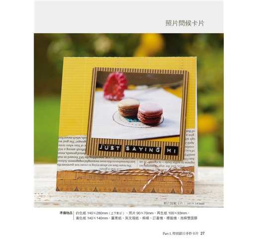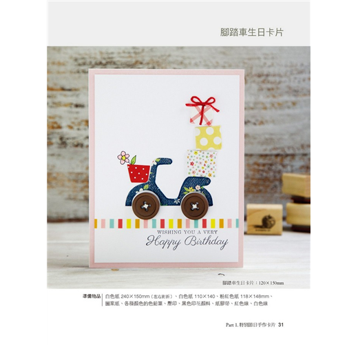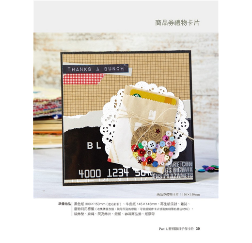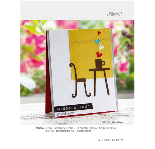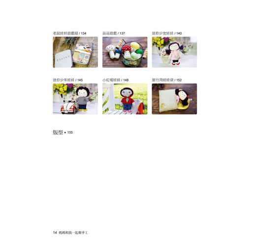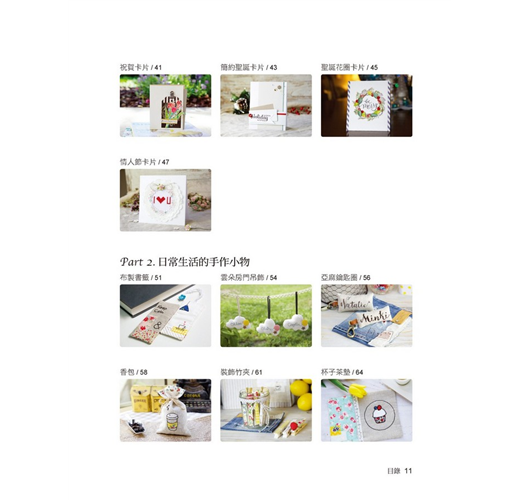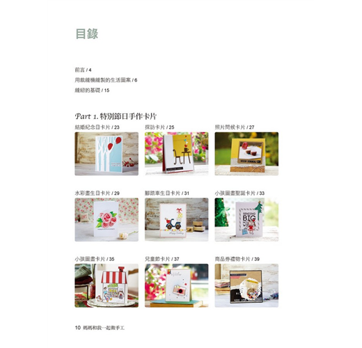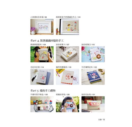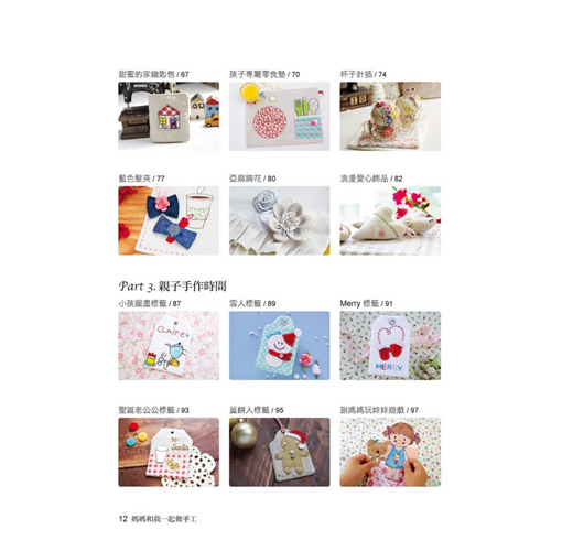 《媽媽與我一起做手工》主要分為五大項目,「Part1.特別節日手作卡片」、「Part2.日常生活的手作小物」「Part3.親子手作時間」「Part4.裝著滿滿回憶的手工」、「Part5.愛的手工禮物」等。透過各位的創意和製作,每個作品將呈現出不同個性的一面。