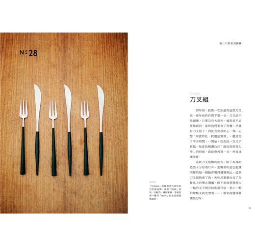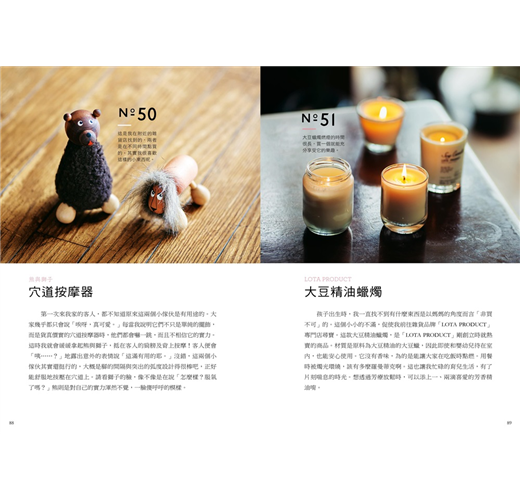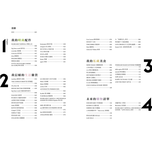 這本書蒐羅了我心目中的寶貝物品,不少都是以我個人偏好挑選出來的,像是心愛的服飾、配件,生活不可缺少的雜貨用品,以及不容錯過的美食等等。