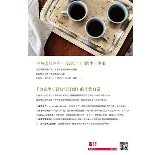 對生活擁有獨到見解、具有藝術美學背景的東京雜貨設計師,透過服飾、雜貨、食器、文具的挑選,分享77件讓生活更具品味風格的選物練習,讓好東西為生活帶來自信能量。
