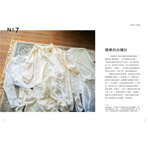 其實我本身很常穿洋裝,但我從來沒有想過要離開白襯衫。白色落落大方,整潔清爽,能和所有顏色搭配。當整體印象模糊不清時,加上一件白襯衫,立刻就很鮮明亮眼。不只如此,穩定的白色,還是陪伴我冒險的好夥伴。當我發現一件單品,心想「不曉得這件適不適合我」時,一定會試著搭上白襯衫。我發現,搭配自己穿慣的基本款,不論什麼樣的衣服,都可以塑造出自己的風格,好神奇啊。
