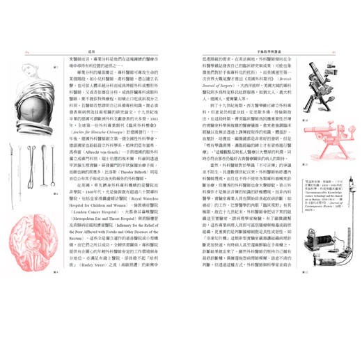 這本書適合大膽的人服用。其中收錄上百張繪製精美卻詭譎的19世紀繪畫。作者重現了外科醫師揮舞手術刀、切割人體的畫面,而手術刀不過是眾多手術器械中的一項,另外還有鋸子、剪刀、探針、鑷子、針、鉗夾、結紮線等。我實在不敢想像這些器具刺進重病或重傷的脆弱人體。 ──Joanna Bourke, ""The Story of Pain: From Prayer to Painkillers"" 的作者/The Daily Telegraph 英國每日電訊報