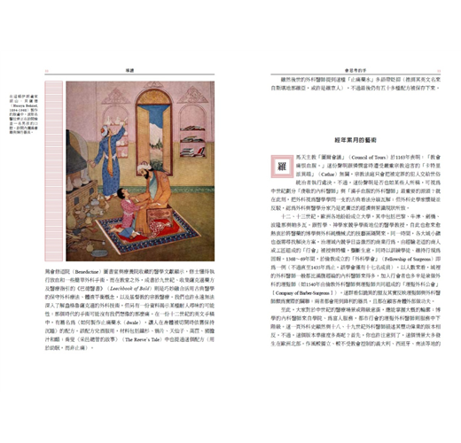 羅馬天主教「圖爾會議」(Council of Tours)於1163年表明:「教會痛恨血腥。」這份聲明跟憐憫當時遭受嚴重宗教迫害的「卡特里派異端」(Cathar)無關,宗教法庭只會把被定罪的犯人交給世俗統治者執行處決。不過,這份聲明是否也如某些人所稱,可視為中世紀劃分「虔敬的內科醫師」與「滿手血腥的外科醫師」最重要的源頭?就在此刻,把外科視為醫學學問一支的古典看法分崩瓦解;但外科史學家懷疑並反駁,認為外科與醫學分家乃是更廣泛的經濟與智識現狀所致。 十二、十三世紀,歐洲各地紛紛成立大學,其中包括巴黎、牛津、劍橋、波隆那與帕多瓦。跟哲學、神學家競爭學術地位的醫學教授,自此也愈來愈熱衷於將醫藥的博學與外科純機械式的技藝區隔開來。同一時間,各大城小鎮也亟需尋找解決方案,治理城內競爭日益激烈的商業行為。由經驗老道的商人或工匠組成的「行會」被授與特權,壟斷生意,同時以訓練學徒、維持行規為回報。1368∼69年間,於倫敦成立的「外科學會」(Fellowship of Surgeons)即為一例(不過直至1435年為止,該學會僅有十七名成員)。以人數來看,城裡的外科醫師一般都比滿腹經綸的內科醫師來得多,加入行會者也多半是兼做外科的理髮師(如1540年由倫敦外科醫師與理髮師共同組成的「理髮外科公會」[Company of Barber-Surgeons])。這群看似詭異的盟友其實反映理髮師與外科醫師頗為實際的關聯:兩者都會用到鋒利的器具,且都在顧客身體外部做功夫。 至此,大家對於中世紀的醫療場景或階級意涵,應能掌握大概的輪廓;博學的內科醫師來自學院、為富人服務,都市行會的理髮外科醫師則服務中下階級。這一頁外科史顯然與十八、十九世紀外科醫師描述其豐功偉業的版本相反,不過,這個版本準確度多高呢?首先,你也許注意到了,這個情景大多發生在歐洲北部。作風較獨立、較不受教會控制的義大利、西班牙、南法等地的大學已發展出自己的「理論外科」傳統(theoretical surgery),與德、英「理髮師兼外科醫師」、著重行會實務經驗的體系截然不同。「理論外科」受希臘羅馬與阿拉伯醫藥著作滋養(其中包括蓋倫樹立的外科典範),採用與大學醫學系統相同的「體液法則」(humoral principles);同時也開始建立屬於自己的學術圖書館。約莫1225年,南義的薩萊諾醫學校(Salerno medical school)編纂了班貝格(Bamberg)某匿名外科醫師所寫的著作(亦是目前已知西方最早的外科論文)執行外科手術。 即使在歐洲北部,現存文獻亦顯示內科醫師與外科醫師之間的分野可能是模糊的。英國布里斯托與諾維奇各自成立結合醫學、外科、理髮師的聯合行會,這可能是繁忙的中世紀港口城市因應包羅萬象的臨床工作的結果。同一時間,格洛斯特公爵(Humphrey, Duke of Gloucester)的內科醫師、後來成為牛津大學校長的吉伯特.基默(Gilbert Kymer)帶領一群內外科醫師向倫敦市長請願,希望成立一所掌理倫敦所有醫療實務工作的聯合學院。雖然基默的學院在1423年獲特許成立,卻迅速從歷史中銷聲匿跡;若連同其他類似案例來看,顯然這種「專業領域模糊處理」的方式可能導致內部成員因爭奪優先地位而引發爭端。1210年成立於巴黎的聖科姆學院(College de St Cosme)採取內外科醫師合組學系、共同管理一套融合實際操作與理論教育的學程計畫,授與學生三種層級的證書。然而,在聖科姆成立的最初幾個世紀,學院幾乎被學系成員、巴黎理髮師、外科醫師之間的爭執搞得四分五裂,導火線則是選讀不同學位的學生彼此交惡。就在學院將解剖學納入課程之際(主要由內科醫師主持,但實際執行者是外科醫師),這類衝突終於發展到最高峰;一直到1516年才終於止息。 聖科姆的緊張狀態之所以解除,部分原因或可歸咎於內外科醫師有了共同的敵人:一群不服膺學院與行會體系、恣意執行醫療與手術工作的傢伙。倫敦外科醫師湯瑪斯.蓋爾(Thomas Gale)略帶攻擊性地稱這群人是「公開殺人者」、「粗魯的江湖術士」(rude empirikes)。這群沒有執照的大夫並非各個都如蓋爾描述的那般草菅人命,他們有些只執行單一手術,如摘除尿路結石或清除白內障,而且技術或是不可思議地精良或是極差,但他們提供具實際威脅性的反面教材,讓內外科醫師能進一步主張他們在專業上的正統與權威。克里斯多佛.勞倫斯(Christopher Lawrence)與維維安.紐頓(Vivian Nutton)也認為,由於史學家把焦點放在內外科醫師之間的衝突,以致忽略了聖科姆試圖引導雙方成員將所學與文藝復興人本主義相互連結的方式與努力。喬叟筆下的內科醫師(Doctour of Physik)是「可執行內科醫療與外科手術的人」(另外還懂占星術和「自然魔法」magik naturel);在他1363年完成的《偉大的外科手術》(Chirurgia Magna)一書中,法國外科醫師喬利亞克(Guy de Chauliac)率先以人本主義觀點定義外科醫師: