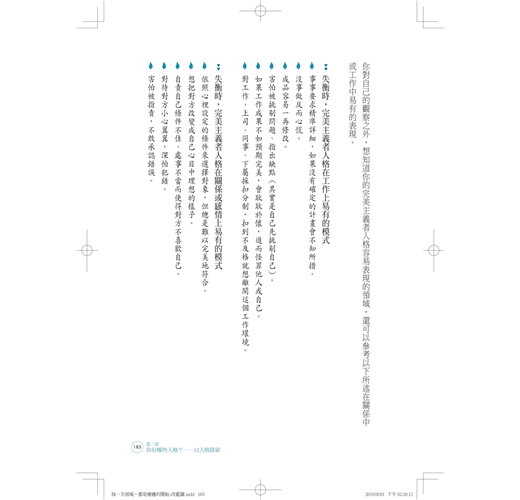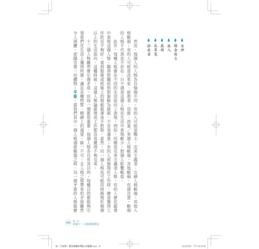 本書詳解各人格平衡狀態佳的時候在各領域的良好運作(例如完美主義者人格在工作上可以是細心謹慎、注重細節的),也會說明當這個人格失衡時會為讀者帶來哪些困擾(例如完美主義者人格失衡時,可能造成當事人對「出錯」這件事的過份恐懼,而累積心理壓力)。