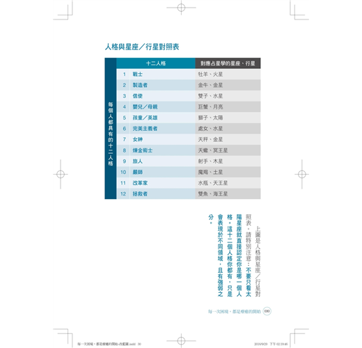 於是,我將龐大的占星系統加以濃縮、歸納成十二種人格的運作,呈現十二種類型的生命課題,讓大家透過十二種人格的言行與情緒,往內探索到自己的內在狀態、恐懼與傷痛。有困難、痛苦就表示生命有相關課題,而我們都可以感覺到困難與痛苦,接下來只需在困難與痛苦中更進一步覺察與剖析。和占星相較之下,「探索十二人格」同樣可以領悟今生的課題,同樣能夠找得到面對課題的做法、療癒傷痛的方法,卻可以省去學習占星的繁複過程。