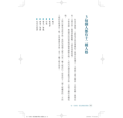 「戰士人格」、「製造者人格」、「信使人格」等「十二人格」分別來自十二星座,可說是十二星座原型的「人格化」。這十二個人格原型就像十二個演員,共同為我們每一個人的生命攜手合作一齣獨一無二的劇碼,為我們創造各種具備挑戰性的困境,也創造美好的經驗讓我們享受生命。在本書第三章中,將有針對十二個「人格原型」簡潔詳細的介紹和療癒指引。