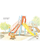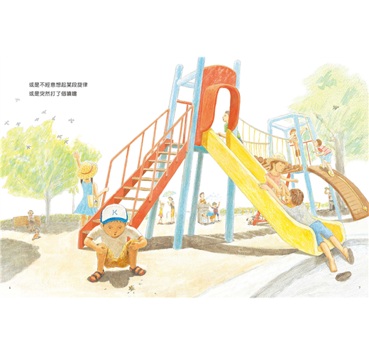 一翻開繪本就感受到一股湛藍的夏天氣息。但隨之映入眼簾的是,死亡的油蟬以及發現了「死亡」的男孩。是的,那樣脆弱的生命在不久前,其鳴叫聲還伴著微風穿過樹葉間,宣告著夏日的到來,但如今已開始被螞蟻肢解為美味佳餚。凝視夏蟬死骸的男孩或許感受到生命的無常。但再翻一頁,鏡頭隨之拉遠,公園裡、滑梯邊,其他的孩子依然熙熙攘攘地嬉鬧著,油蟬的死亡就像一片羽毛輕輕墜落於地,無聲無響。地球依然轉動,人們為了生活依舊忙碌著。死亡的夏蟬映照著公園中所有活著的生命的動作、感受、欲望。那是隨心運動的自由和欲望獲得時滿足的美好感受。是的,活著真好!