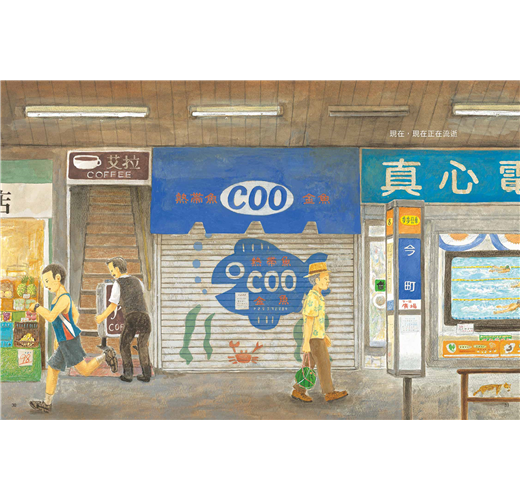 細緻寫實的場景與圍繞在小男孩那一天生活中的家人、鄰居或路人的活動與表情,是如此平凡、如此日常,在在讓讀者感到親切與熟悉,彷彿是自己童年中的某個片段。而此時,谷川俊太郎的詩句,就像是「微電影」中意味深長的旁白,與畫面互相補足、並更加擴充延展,圖與文的協奏,允許、也邀請讀者一面看著畫家演繹的圖像,一面將詩句中的意象,轉譯成自己版本的「微電影」。