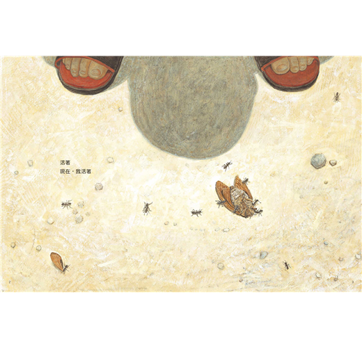 本書繪者岡本義朗採取了非常高明的手法,題名為活著,他卻從一隻夏蟬的死亡開始說起,一路採取電影運鏡的方式,讓讀者跟隨著畫面中男孩去經歷他的這一天,緊密的與詩文結合,也補足了詩的留白,更透過畫面的細節,來強調生命的循環與傳承,整本書,自封面到封底的圖畫,都充滿令人驚豔的細節,孩子可以讀詩、讀畫,在其中,也讀出屬於自己的生命故事。