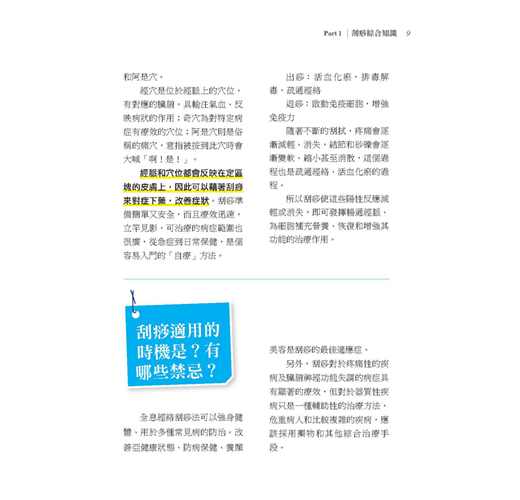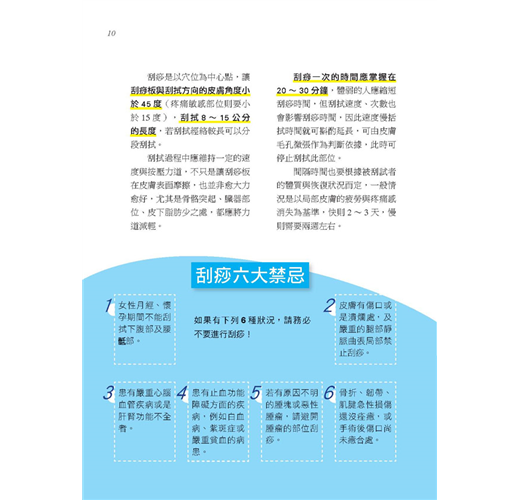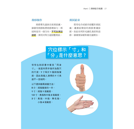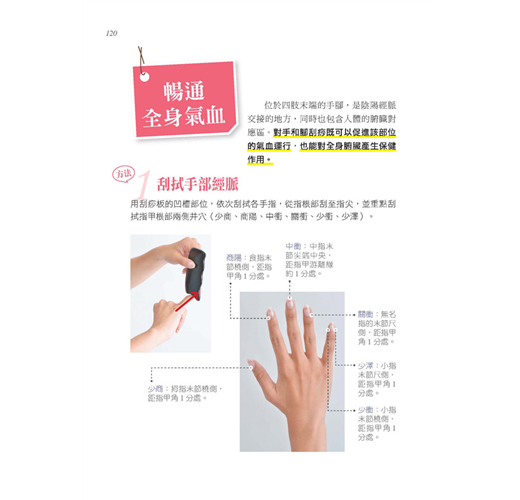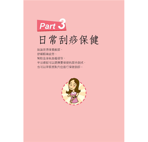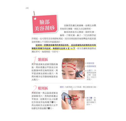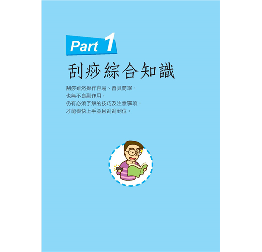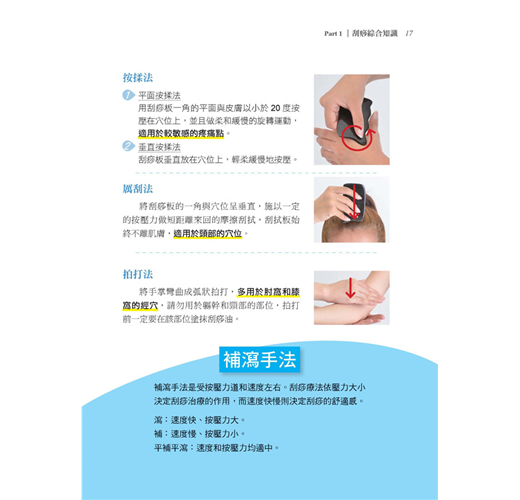 說明各式運板方法,如面刮法、厲刮法、角刮法、按揉法等,並指出適用部位,讓你更快、容易上手。