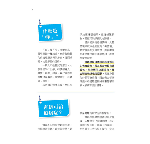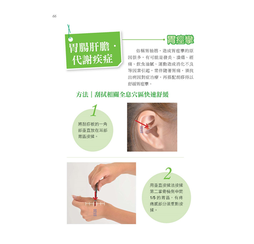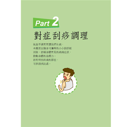 囊括常見的五大項目疾病,緊急傷痛疾症、頭部五官疾症、筋骨痠痛疾症、胃腸肝膽.代謝疾症、內分泌.其他疾症,一刮啟動內在自癒力,擊退大小病痛症狀,讓你愈刮愈輕鬆。