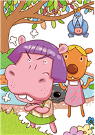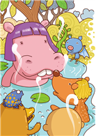 「當然!我不是──母犀牛!」河馬小姐口氣裡充滿了火氣,雙眼裡全都是白眼,她氣沖沖的說:「我是河馬,一出生就是河馬!我爸爸是河馬,我媽媽是河馬。森林裡的動物們從小就認識我──我是河馬!」