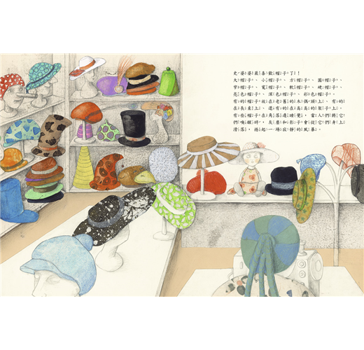 2.故事評介:在史婆婆的店裡,不同的帽子對應著不同的心情,作者以豐富的想像力,為形形色色的人們發明了各式各樣的帽子,帽子的功能總是能讓讀者會心一笑。但是本書不只是有趣的帽子展示會,最後一段的小轉折,更讓帽子的隱喻推到更心靈的層面。故事中的帽子不只是情緒的外顯,更是內心的映照。即使再怎麼熱愛帽子的人,有時候也會什麼都不想戴,只想靜靜地讓風吹過髮絲,然後哈哈大笑!