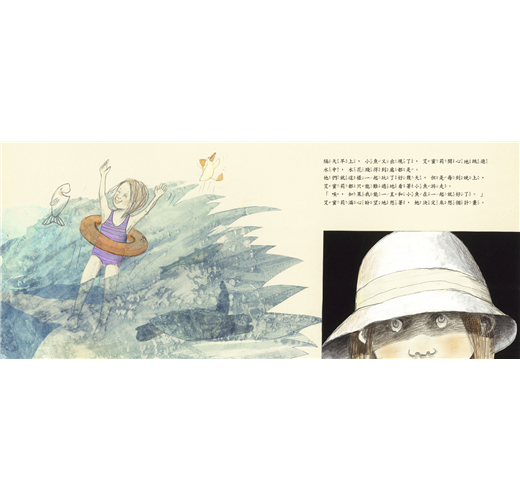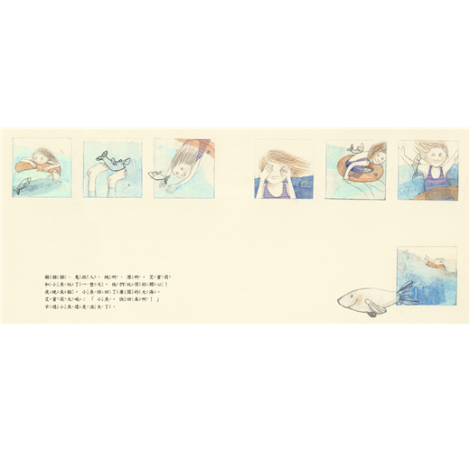2.故事評介:本書場景設定在海邊,那是艾蜜莉和小魚一起玩樂的地方,也是他們彼此世界的交會處。作者細膩地以大海的變化反應故事走向,象徵主角的內心世界。一開始大海的味道鹹鹹的,怪怪的,映照出艾蜜莉內心的不安。當艾蜜莉想要抓住小魚時,大海變得黑暗,甚至還出現了腐爛的臭味,似乎暗示著有一場風暴即將到來。最後,當一切雨過天晴,大海的味道又變得好新鮮、好熟悉。