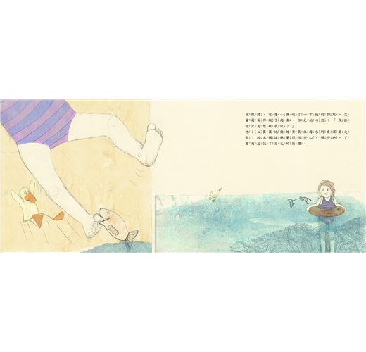 1.畫風評介:本書繪者以水彩、色鉛筆與拼貼方式作畫,色彩柔和、質感細膩。值得注意的是,以大量藍色描繪的海洋場景,雖然都是藍色,但是每一幅的深淺、筆觸、媒材皆不太相同,大海的顏色映照著艾蜜莉的心情。一開始是帶點畏懼,好像前方有場冒險的藍,和小魚玩耍的大海則變得澄澈,水彩創造出的水痕讓畫面變得豐富。抓住小魚的背景又厚又重,好像壓得心情喘不過氣。最後,淡淡的海水再度出現,一切又歸於平靜。