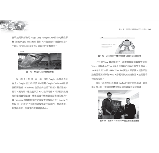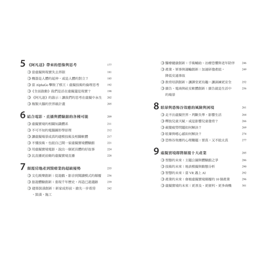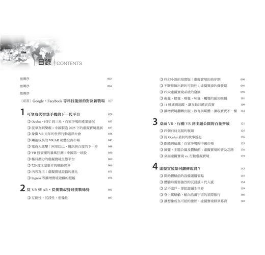 VR/AR科技帶來的影響不止如此,VR科技更能帶來創造出超越時間、空間的真實感官體驗:在VR虛擬空間中,藉著高擬真的動畫技術,可充分還原過去的歷史文物與事件景況。此外,VR/AR科技深深影響、顛覆著各行各業和使用者的互動方式,涵括了娛樂、影視、旅遊、教育、醫療、教育、零售、房產等等,本書特別精選了十大產業做了詳細說明,相信讀者們讀完後將獲益匪淺。