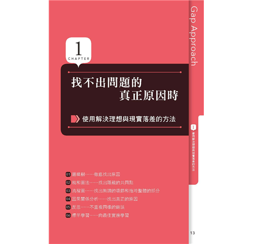 作者以實務經驗告訴我們,許多問題無法解決的關鍵,就是不知道如何「分類」。因此,他將日常生活中會遇到的難題概分成七大類,以「邏輯樹」找出問題發生的原因;運用「親和圖」分析問題背後的共同點;從「流程圖」中,看清無謂環節和拖垮整體的部分……帶你探索問題根源和因果關係、拆解步驟,並透過反思,直搗問題的核心,進而提供具體實踐方法,讓你輕鬆排除障礙,找到因應對策。