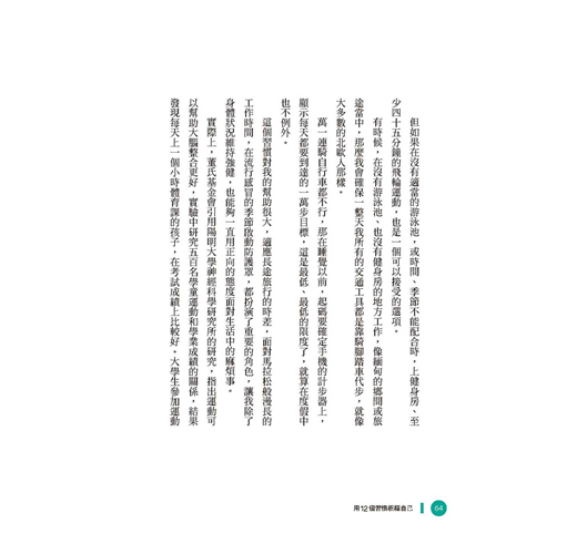 於是,我做了一個重大的決定,那就是養成「一天不安排自己做超過兩件事」的習慣。如果這天有一場演講跟一場會議,我剩下的時間,就要留給自己,把時間留給自己好好吃飯、睡覺、思考、發呆、喝咖啡、散步、運動。