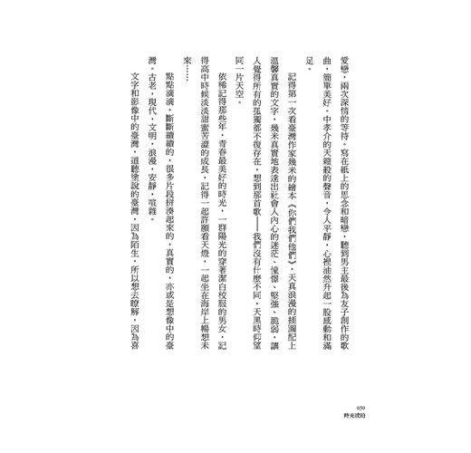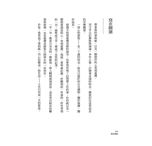 第一次翻看書稿,一頁一頁讀下去,文中的情景,漸次張開,將我的情思吸住、帶入。我看到一個青春的生命,是如何在切換兩岸社情民風、切換青春橋段的歷程中,執著探求自我、探求未來。最讓我印象深刻的,是歐陽鳳的文字,簡約而富有情感。幾乎所有的敘述,都是體悟與感慨,她青春記錄的字字句句,與她的情感起伏、人生思考,水乳交融。開篇她也是這樣給全書下的定義:「一段心的旅程——在二十歲的時光,給自己最好的生日禮物,關於臺灣,關於成長。」全書的張力,不在於敘述的故事多麼奇譎有趣,而是一個二十歲的女大學生悅動、單純、熱切、求索的心靈波瀾,從不同的方位,恣意而為,動人心魄。
