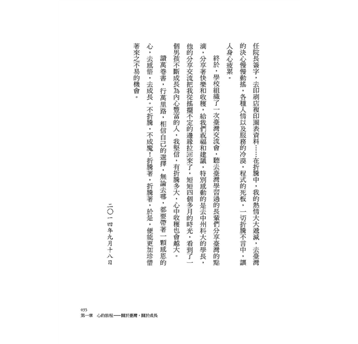 在回臺北前的短暫空檔中,我們有了更深入的交談,才見識到歐陽鳳堅強的一面,原來,她同時面對著心理與身體的壓力,她熱衷從事的公益活動,其實讓學校對她產生了誤解,而她的左眼因為某種因素,造成了視力退化,幾乎快看不見了,但是這些障礙,並沒有澆熄她關愛社會的熱情,在與我們分離後兩天,從微信上又傳來她在北京擔任公益活動訓練員的活動相片,而這個學霸,每天晚上還要抱著一堆書猛啃,準備年底考研呢,這讓我更堅定地要為她完成出版願望,然而,出版計畫雖然早已訂定,我因事冗,卻遲遲無法全力進行出版的後續工作,幸遇思行文化傳播有限公司的陳建安總經理,在他的鼎力幫助下,解決了經費短缺的問題,才有了這本書的問世。