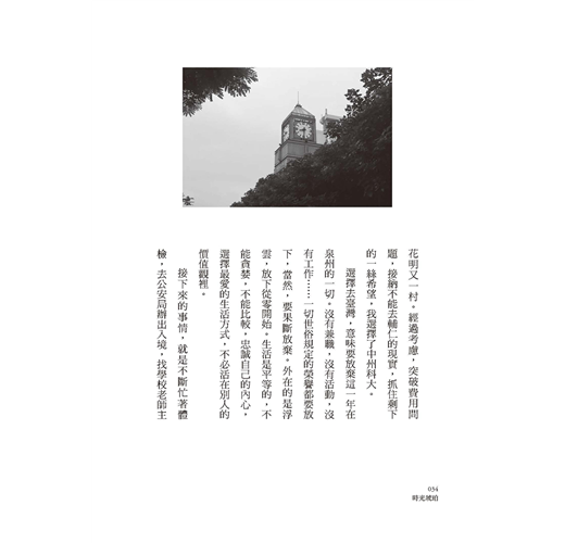 帶著這種好奇閱讀《時光琥珀》,我試圖尋找一些有關臺灣高等教育更優秀的蛛絲馬跡。《時光琥珀》上篇主要記述了作者在臺求學短短的時間裡留下的臺灣印象,從交通到美食到服裝,在這個與大陸幾乎沒有語言和文化障礙的地方,所有的細節都會讓人產生與大陸的對比感。當然,留下記憶最多的還是關於校園生活和對臺灣教育的體驗。臺灣的教學似乎更注重實訓,教學方法更靈活,臺灣學生更活躍、更創新,校園風氣更自由,師資更專業,這些是構成臺灣教育更優質的原因嗎?也許是,可是似乎又不絕對,許多條件在大陸高校中並非完全缺失,那麼,那些在短時間裡實現快速的專業成長的學生,究竟是領受了臺灣教育的何種力量?