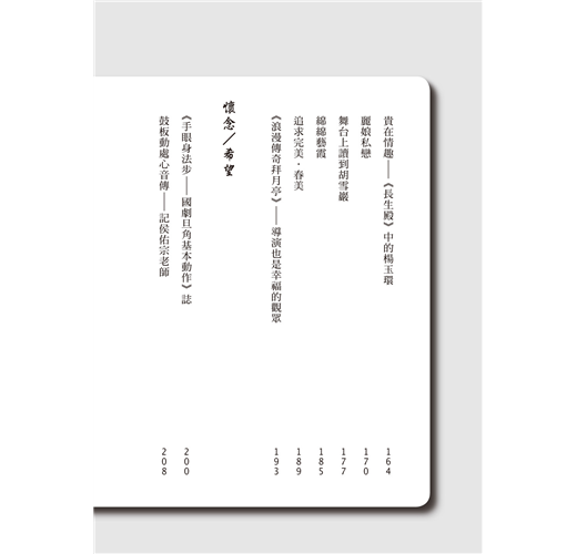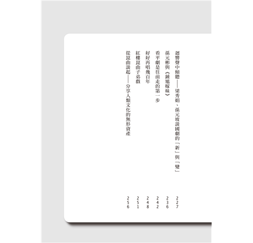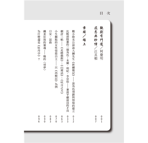國父紀念館、國家戲劇院等大型的劇場啟用之後,戲曲也在那裡演出,一切空間美感的秩序還重建不及,就開始自由發揮,並加強聲光諸種效果,至今依然。有時候變得很巨大,和精緻典雅的韻味距離越遠,好像也越用力了。是不是因此我的筆記就記得少了呢。這本書裡的閒散筆記,按照內容的性質分成三個部分,析論劇本及評介演出的文章收輯在前面,就用「案頭之書」和「場上之曲」來表示,簡稱「案頭」、「場上」。有著歷史人情和滄桑世態,也甚多少男之情和少女之愛,我喜歡講的《西廂記》和《牡丹亭》都在裡面。