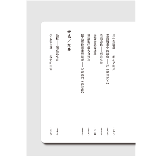 作者析論劇本及評介演出的文章收在「案頭」和「場上」的第一輯中,如《牡丹亭》、《西廂記》、《新繡襦記》等;自己親身參與的演出工作,如導演、編劇或藝術指導等任務,則收錄在「燈亮」和「燈暗」的第二輯部份。而作者曾親近相處的梨園前輩,如梁秀娟、徐炎之、侯佑宗、孫元彬、孫元坡的傳承用心和充滿智慧的語言,以及對一代藝術導師俞大綱的紀念,則收錄在「懷念」、「希望」第三輯文章中。