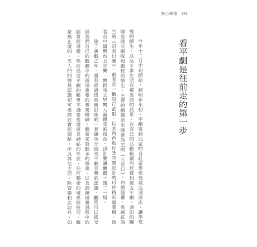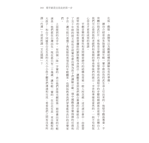 奇妙的就是,碰頭第一篇是談俞大綱老師的劇本和演出,那是一九七六年,我剛回國,他就約我去國藝中心,並且要我在文化藝研所開課,沒想到第二年他就去世了。這麼多年來,很多珠玉和泥沙都牽滾在戲曲的世界裡。而直到最後一篇〈從崑曲談起──分享人類文化的無形資產〉,前輩力挽狂瀾的身影又依稀浮現。我和同年代的許多藝術工作者一樣,年輕時從西方留學回來,學得專業本事,卻選擇依本土立命,繼傳統安身,多美好的過往啊,跟著前輩師長們,我在戲曲世界中開眼也開心,多年後拾掇這幾篇閒散筆記,懷抱曾有的激動,曾有的歡欣,曾有的期望。
