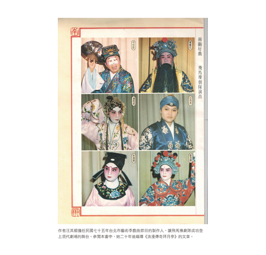 意外而欣慰的是我竟然描述了臺灣自己培養的第一代京劇名角的情貌,胡陸蕙、郭小莊、還有他們這一輩的「大師姐」徐露,足以與京劇分庭抗禮的豫劇皇后王海玲。不意外而深覺慶幸的是,由於在文化國劇組任教的緣分,結識梨園前輩,來自京劇世家的梁秀娟女士、孫元彬先生、孫元坡先生,教崑曲的徐炎之先生,鼓王侯佑宗先生,而且還有機會在他們身邊記下他們的「口傳心授」,他們開闊的視野,作育英才的胸襟。