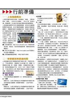 2. 上海旅遊實用資訊:包含如何辦理台胞證、貨幣兌換、電壓、撥打電話、訂房須知、旅遊諮詢單位及當地重要緊急電話等。