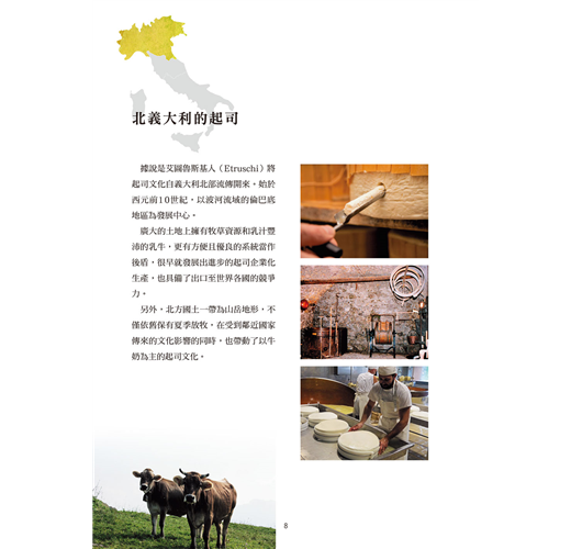 除了48款起司本尊的照片外,亦收錄了富含義大利當地人文風土情懷的風景、牛羊放牧照片,乃至於起司的製程照片等等。以文字搭配照片來相輔呈現,在了解義大利多種起司的同時,也一同認識那些在背後默默守護傳統起司製程的可愛人們!