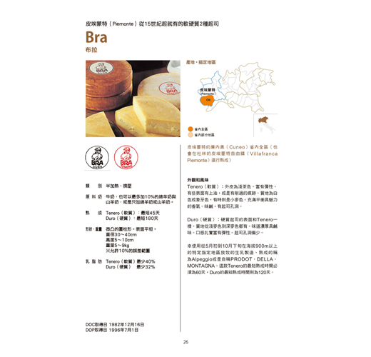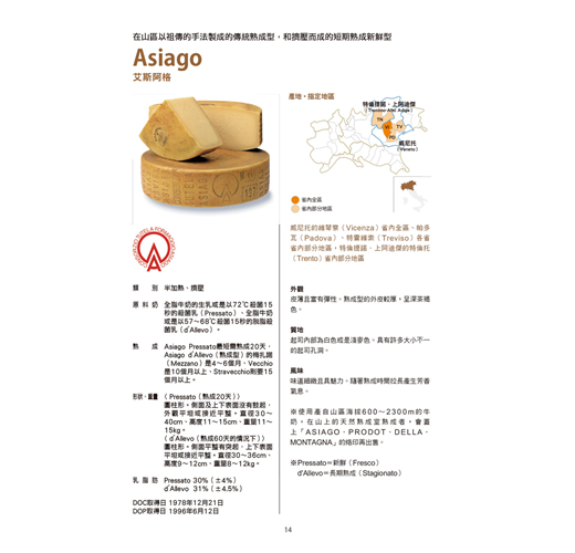 (起司實體照、中英名稱、分布區域示意圖、起司Logo、類別、熟成時間、形狀&重量、風味……)