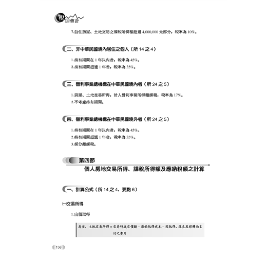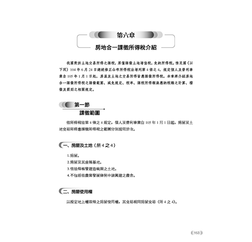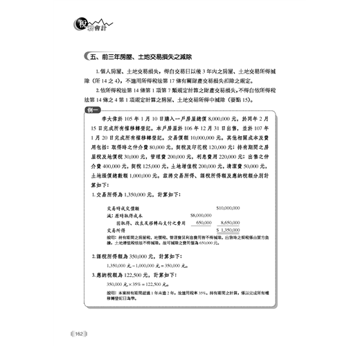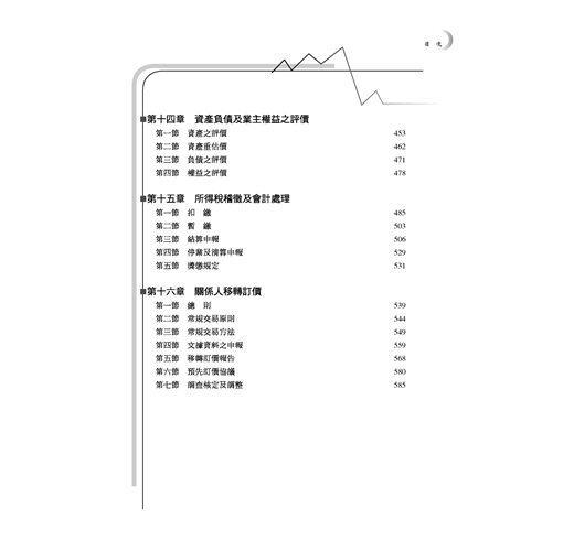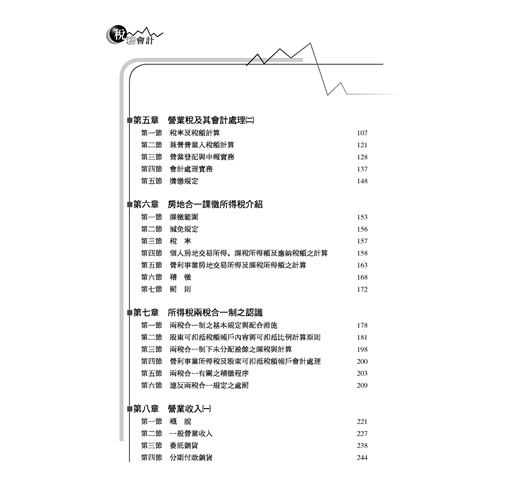 相關稅務法規更新至105年6月,為坊間稅務書籍最新版本。第6章專門介紹「房地合一」課徵所得稅的相關會計實務操作,讓您掌握最新資訊。本書之編寫,建立在全盤租稅架構與整體節稅理念上,係以營利事業為經,各相關稅目為緯,綜合而成一本理論與實務兼備之「稅務會計」最佳參考書籍,對研讀稅務之學生及企業經營管理人員,有相當之助益。再者,本書對(加值型)營業稅之申報、兩稅合一及營利事業所得稅結算申報均有詳盡之表單、說明及實例,對讀者之研習瞭解,可收事半功倍之宏效。