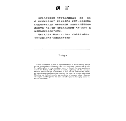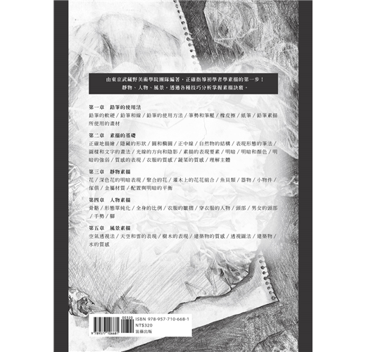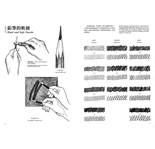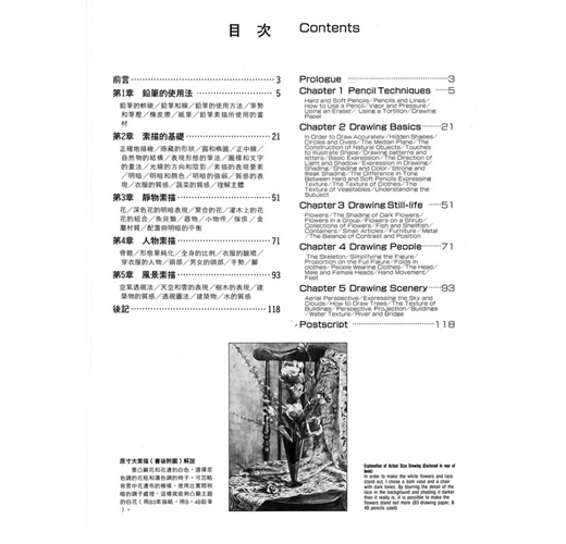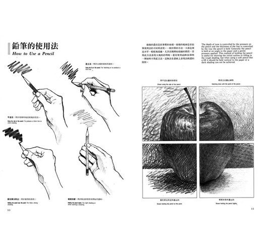 各章節從鉛筆的使用方法、理解物體的結構、表現明暗及質感等基礎知識加以解說,再加上各個不同對象的表現如靜物、人物、風景等,並以具體的圖解及參考例子來解說。