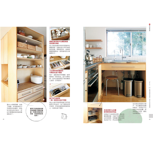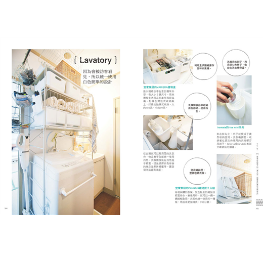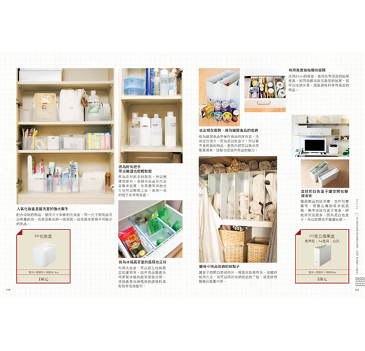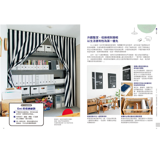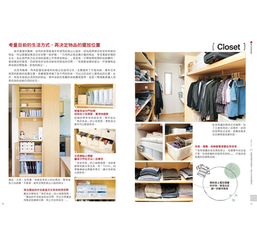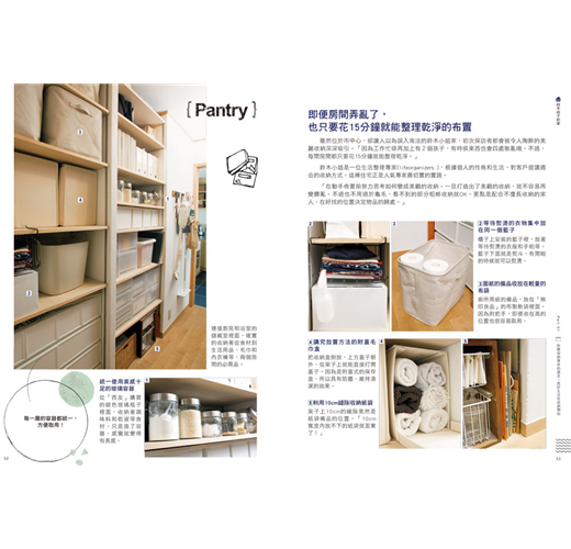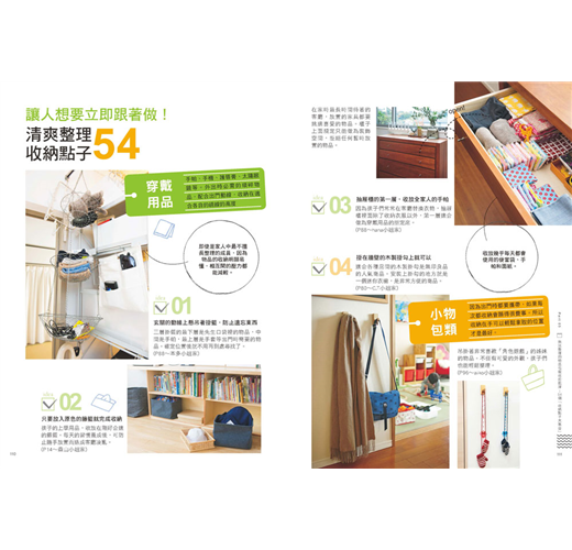 從完整空間的示意圖(客廳、廚房、盥洗室等),到小空間的收納情形(收納櫃、盒子、籃筐等),全書以彩色的清晰圖片讓你看了就能清楚掌握。想要仿效收納技巧的時候,也不用擔心看不明白,另外還附上無印良品等販售的收納商品資料,絕對讓學習收納這件事變得更容易。