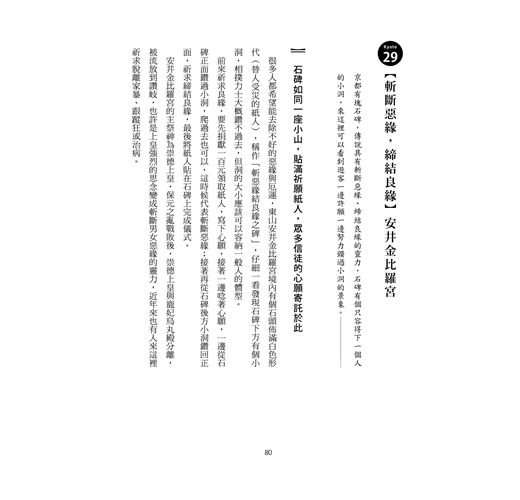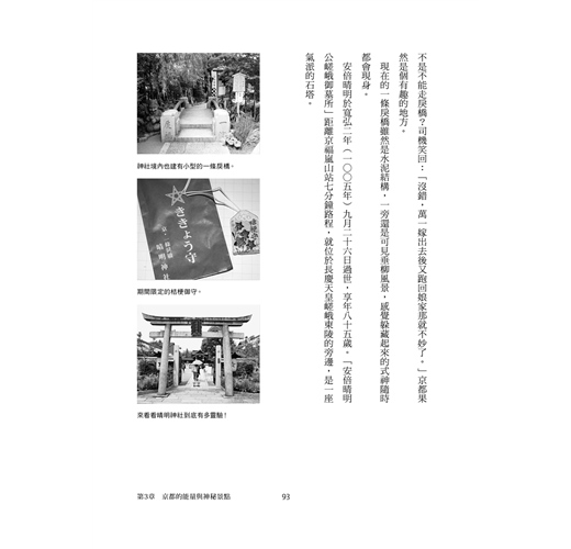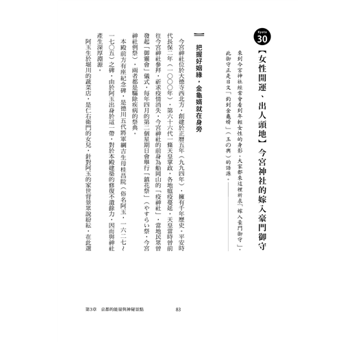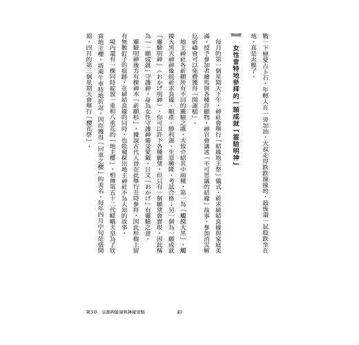 大眾澡堂門口掛著「本日也有」,到底有什麼?站在外頭歪著頭打量招牌的人,不用問就知道是個外地人;當京都人說你像御室櫻時應該高興還是難過?蟲籠窗除了防火,另一個用途能用來幹嘛?來到充滿古寺與神社的京都,總不能不知道哪間神社以什麼靈力最為靈驗吧?