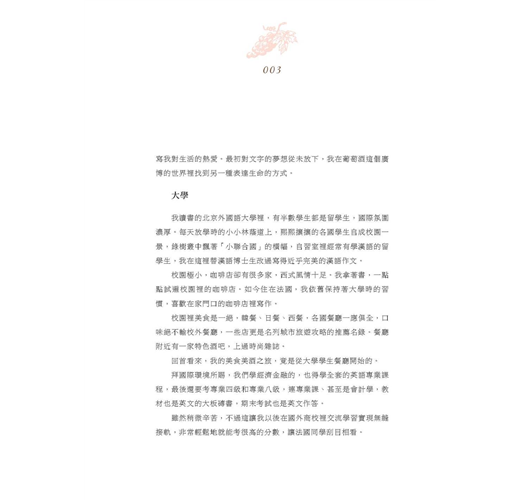 葡萄酒是我熱愛生活的媒介,書寫葡萄酒讓我得以書寫我對生活的熱愛。最初對文字的夢想從未放下,我在葡萄酒這個廣博的世界裡找到另一種表達生命的方式。